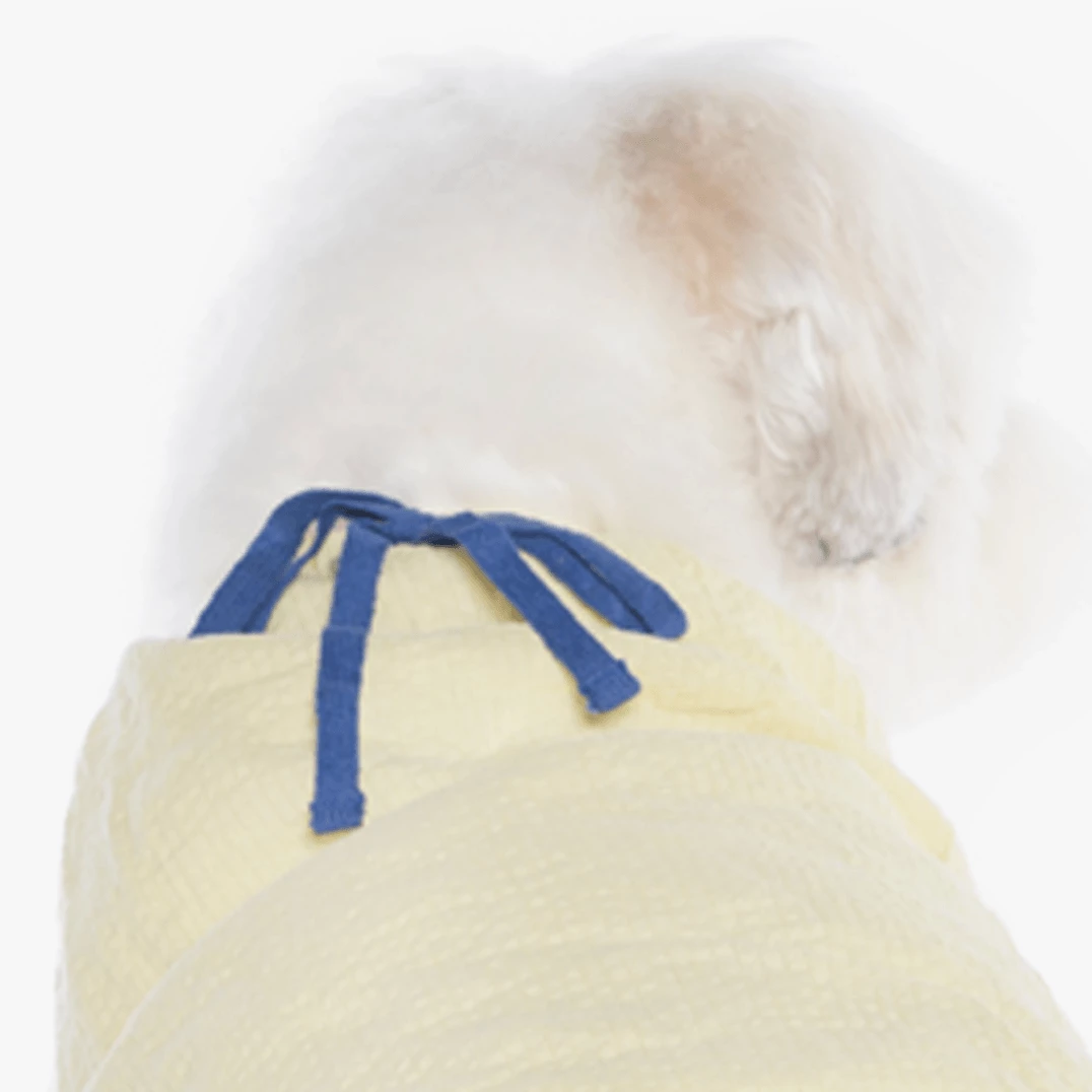 - Ribbon tie closure at neck