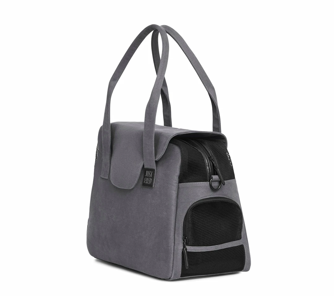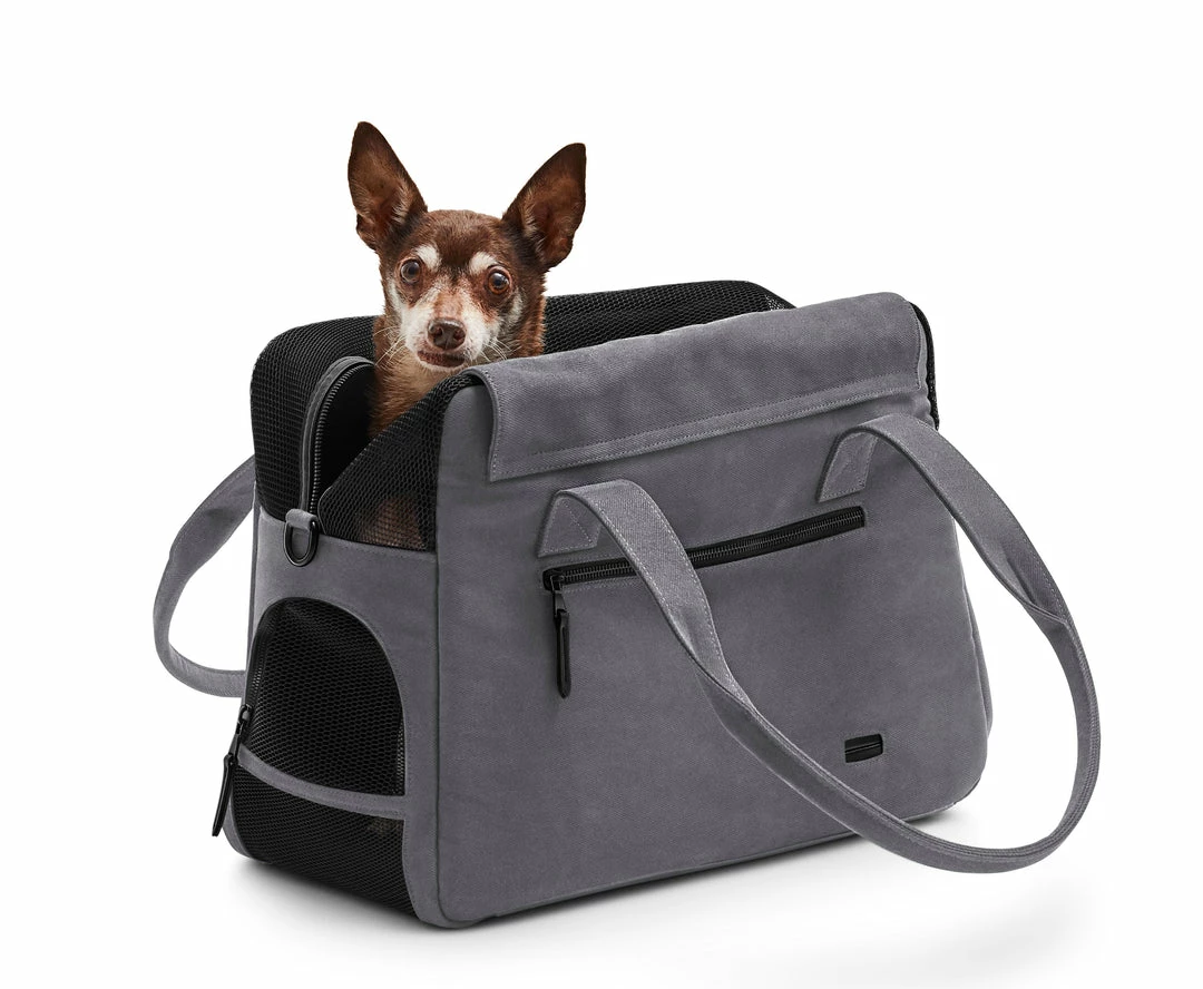 Just Fred’sย Destination Tote allows your fur baby to chill in style and comfort while youโre on the go. Designed with commuting and travel in mind, these TSA compliant*ย sleek, durable canvas totes feature a breathable mesh enclosure and exterior peek-a-boo window that unzips so your pup can see the sights.
