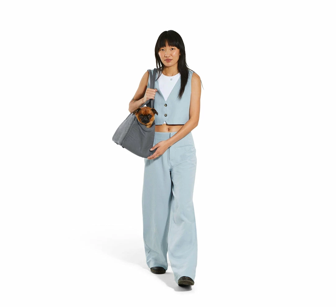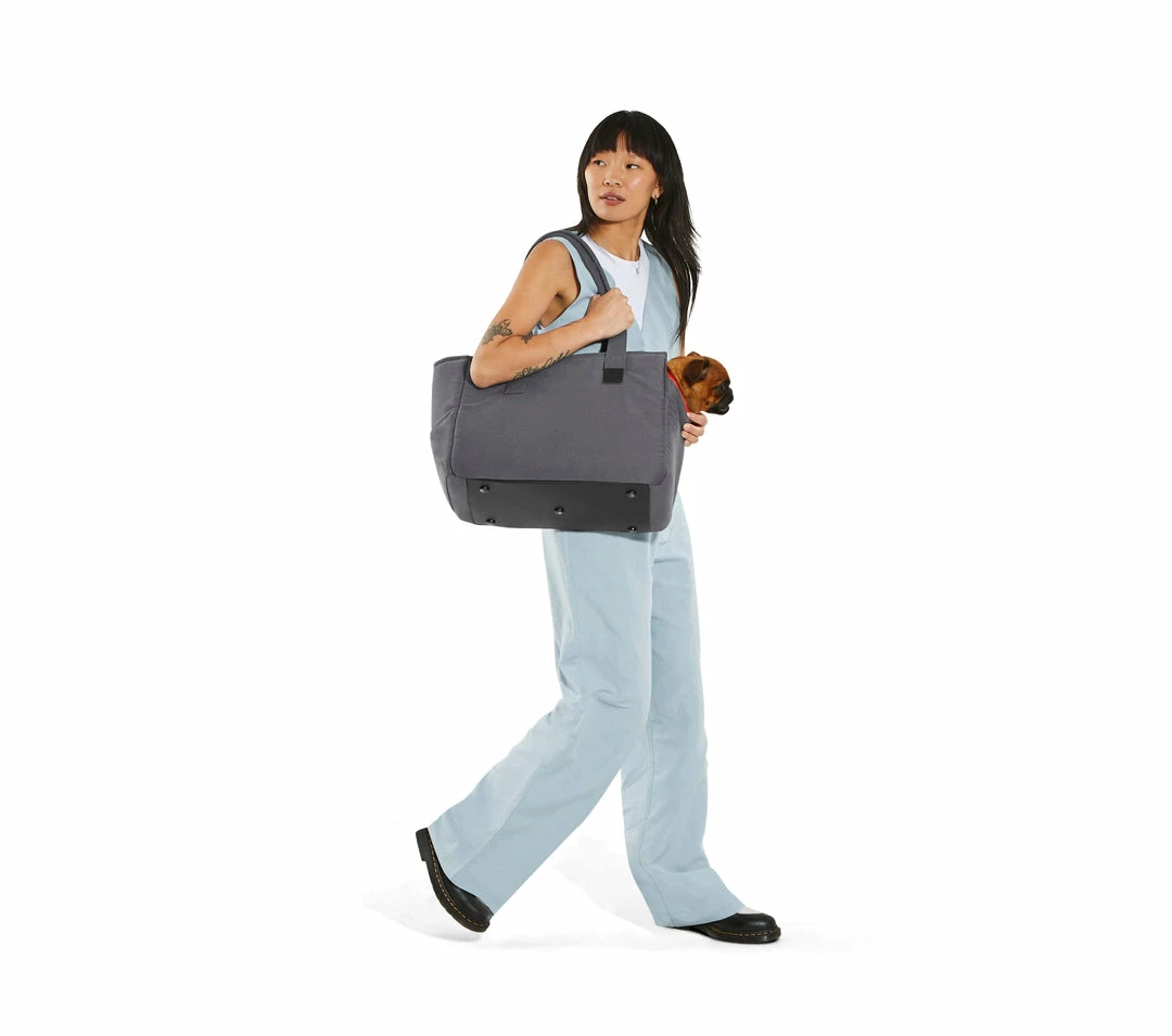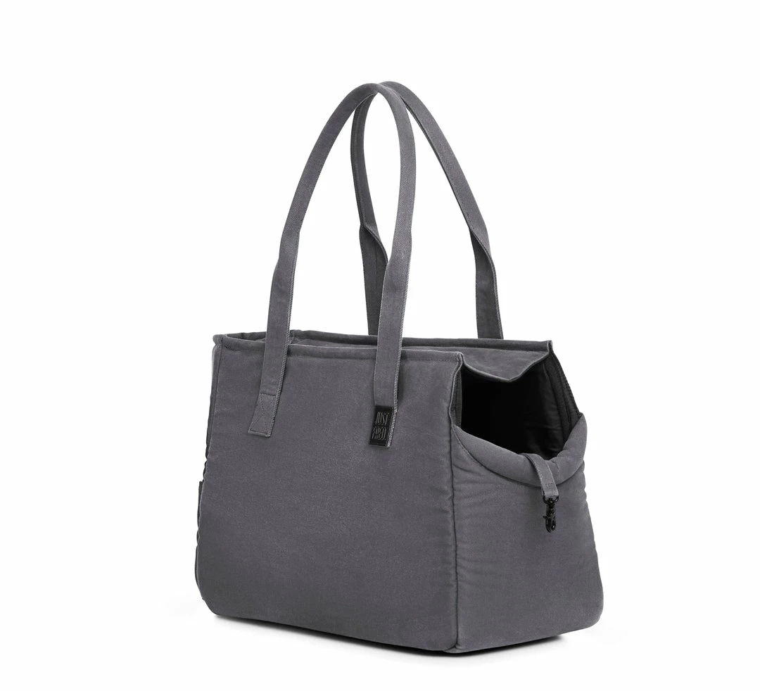 Just Fred’s canvas Weekendย Tote is the perfect casual-chic tote for low-key frolicking with your furry friend. Instead of a mesh enclosure, this carrier zips shut but remains open on the right side. A padded chin rest on the base of the window allows your pup to rest comfortably while sightseeing.ย ย