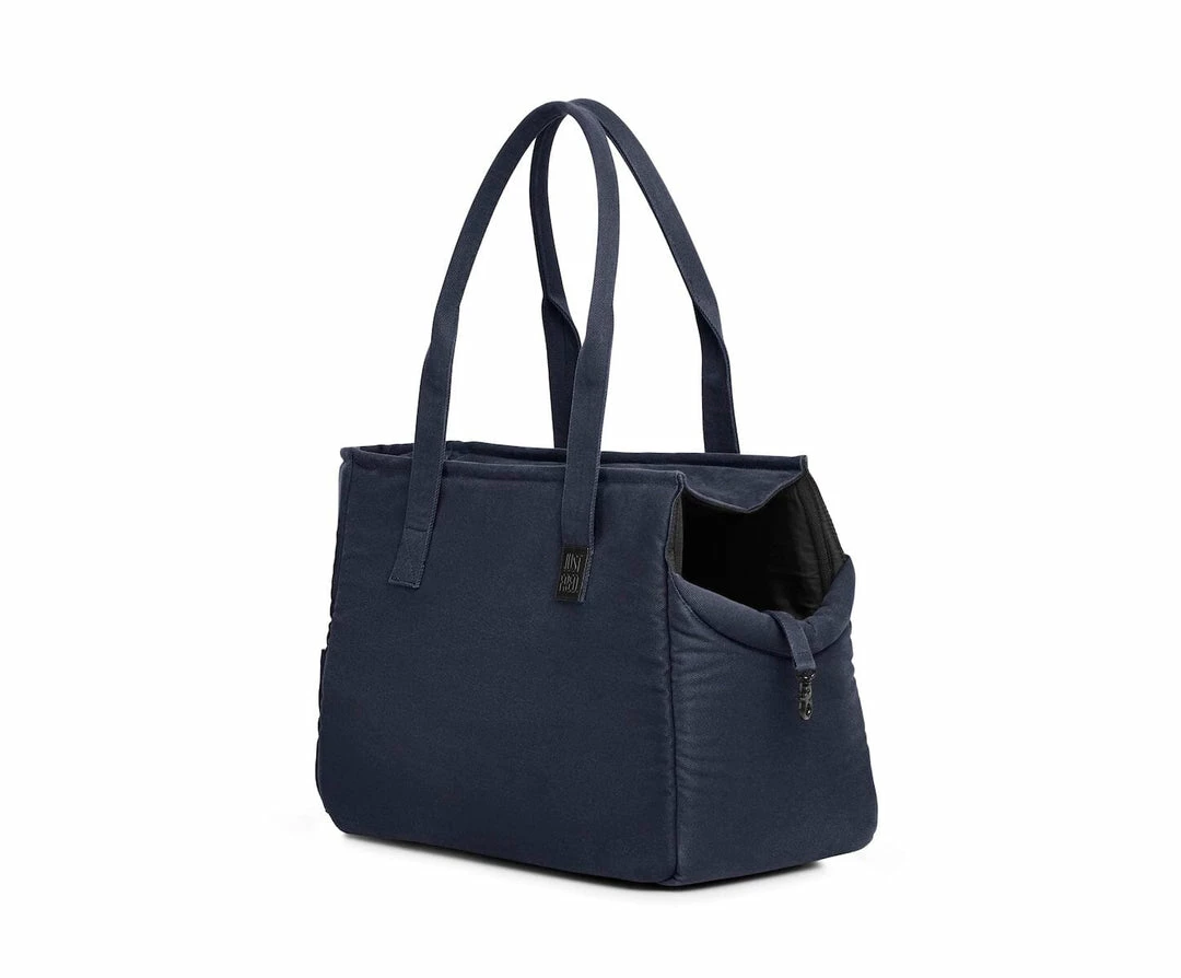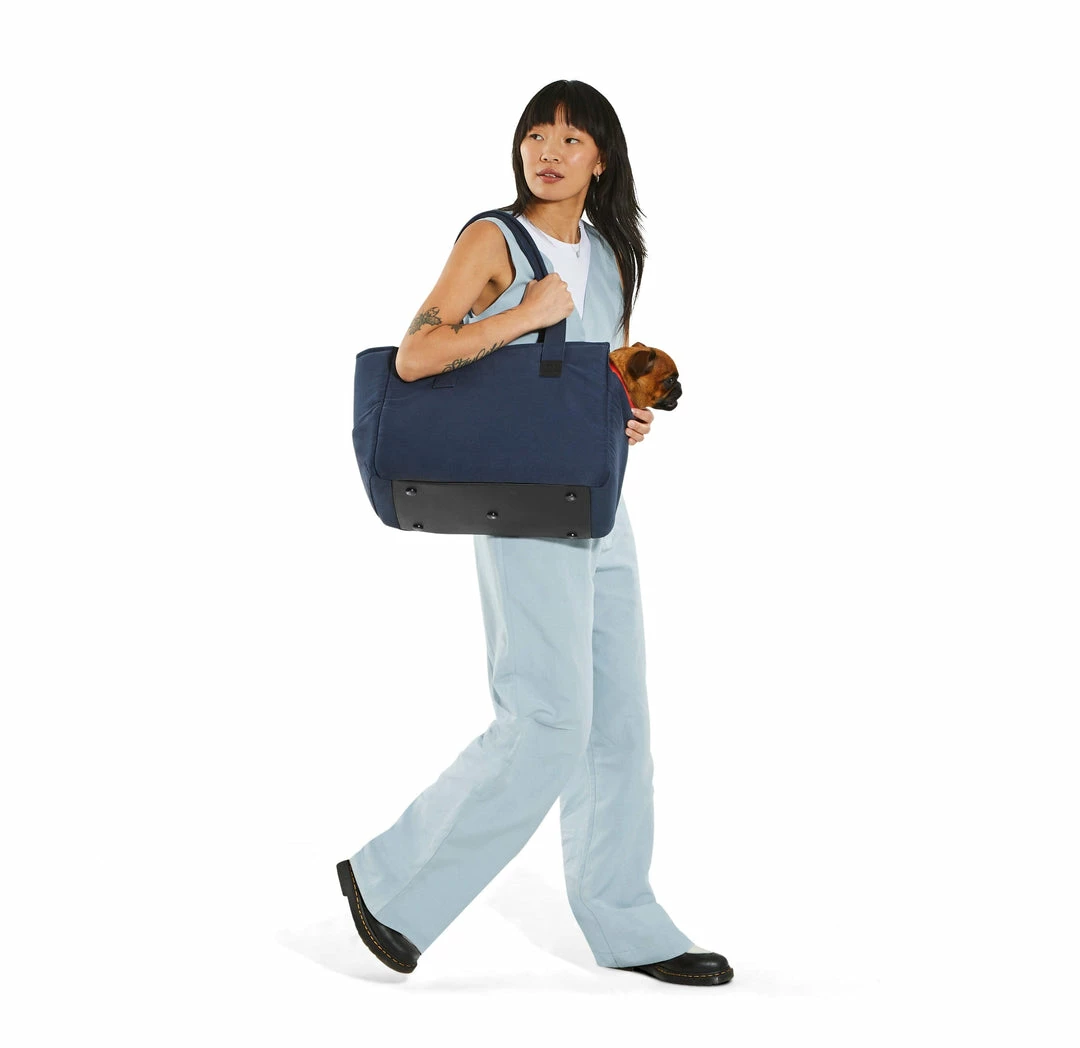 Just Fred’s canvas Weekendย Tote is the perfect casual-chic tote for low-key frolicking with your furry friend. Instead of a mesh enclosure, this carrier zips shut but remains open on the right side. A padded chin rest on the base of the window allows your pup to rest comfortably while sightseeing.ย ย