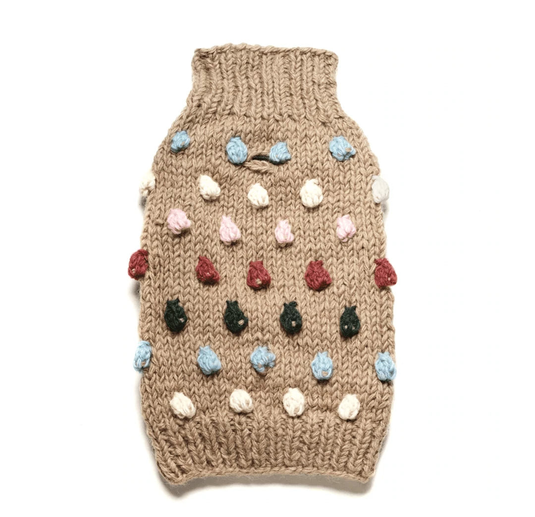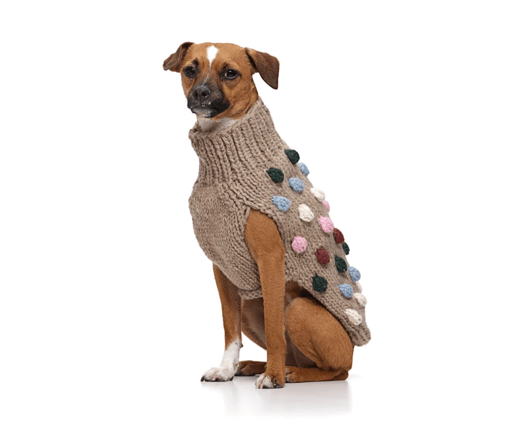 Sweater weather has arrived!Β Blue, pink and rust poms add playful panache to a snuggly-warm dog sweater hand-knit in rich, soft wool and fashioned with a convenient harness opening in the back.