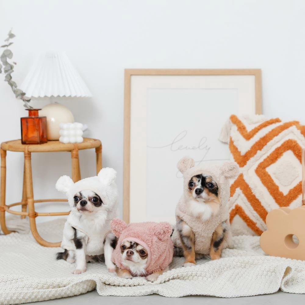- The chihuahua models in white and pink are 4.6 and 4 lbs wearing a size S; the chihuahua in beige is 5.5 lbs wearing a size M. Toy poodle models are 5 and 5.5 lbs and are both in size M.