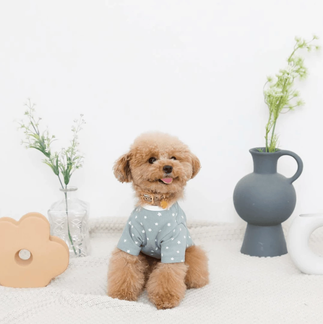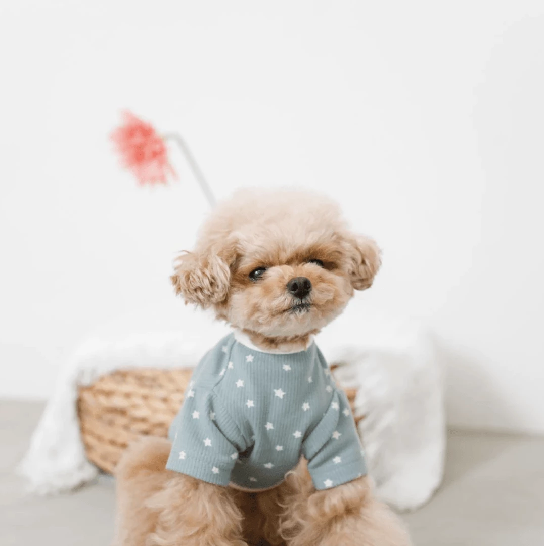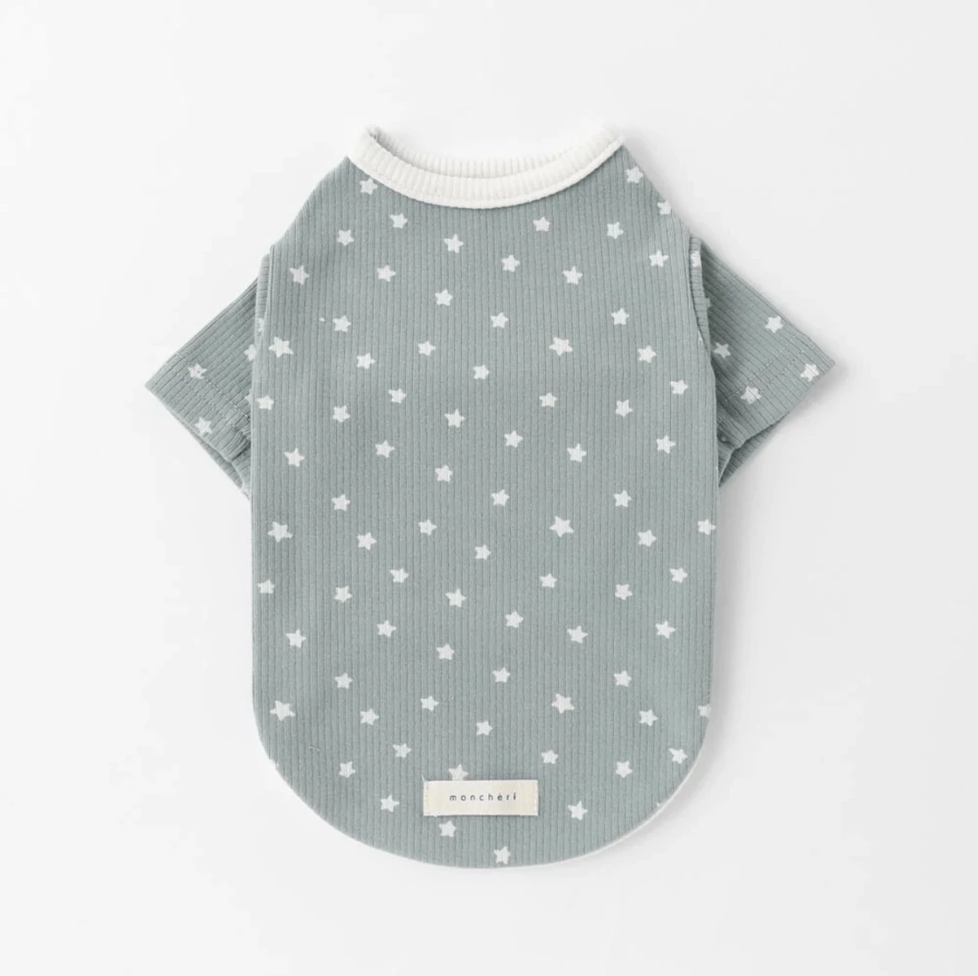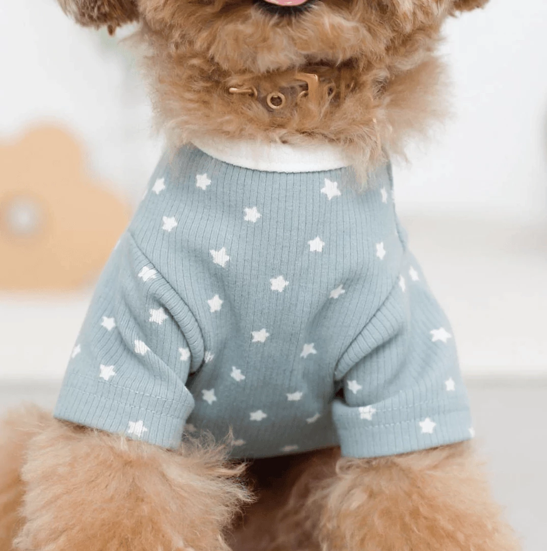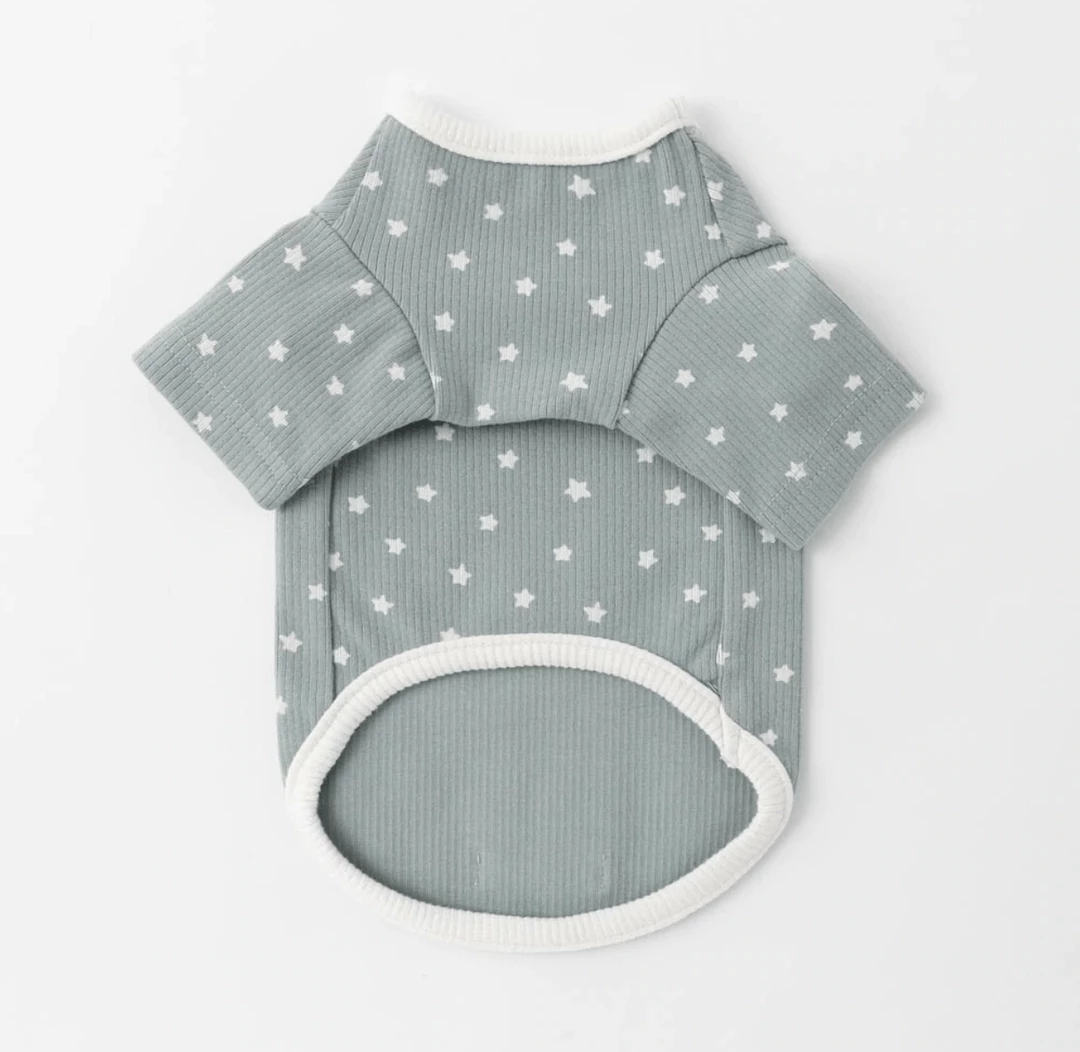 - Pale blue tee with contrasting white collar, hem and star print