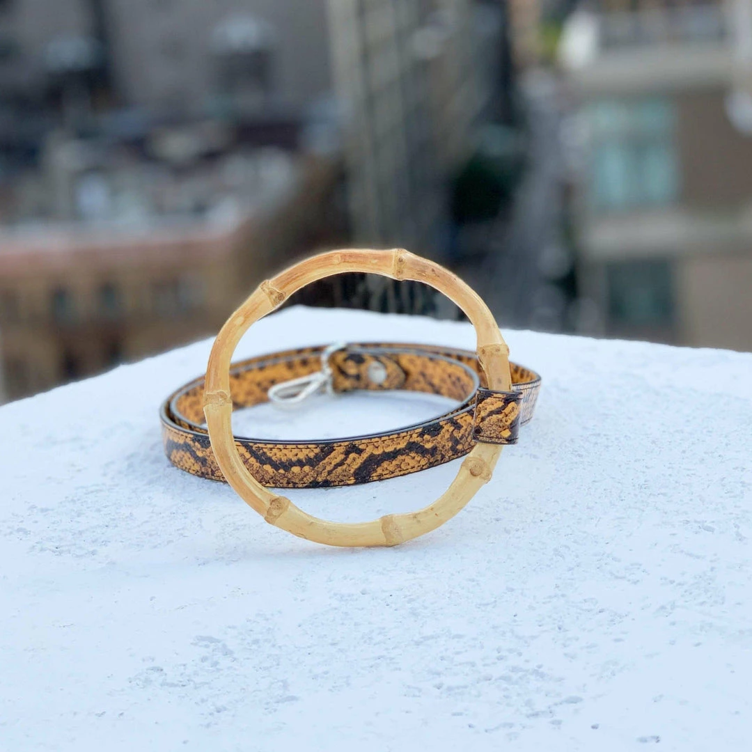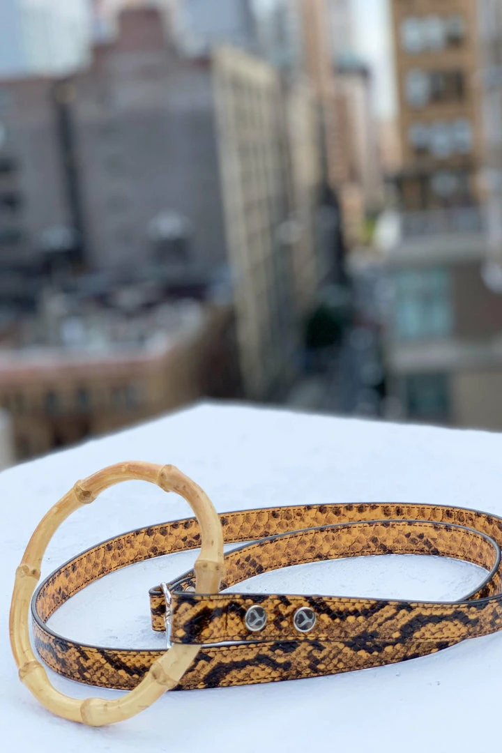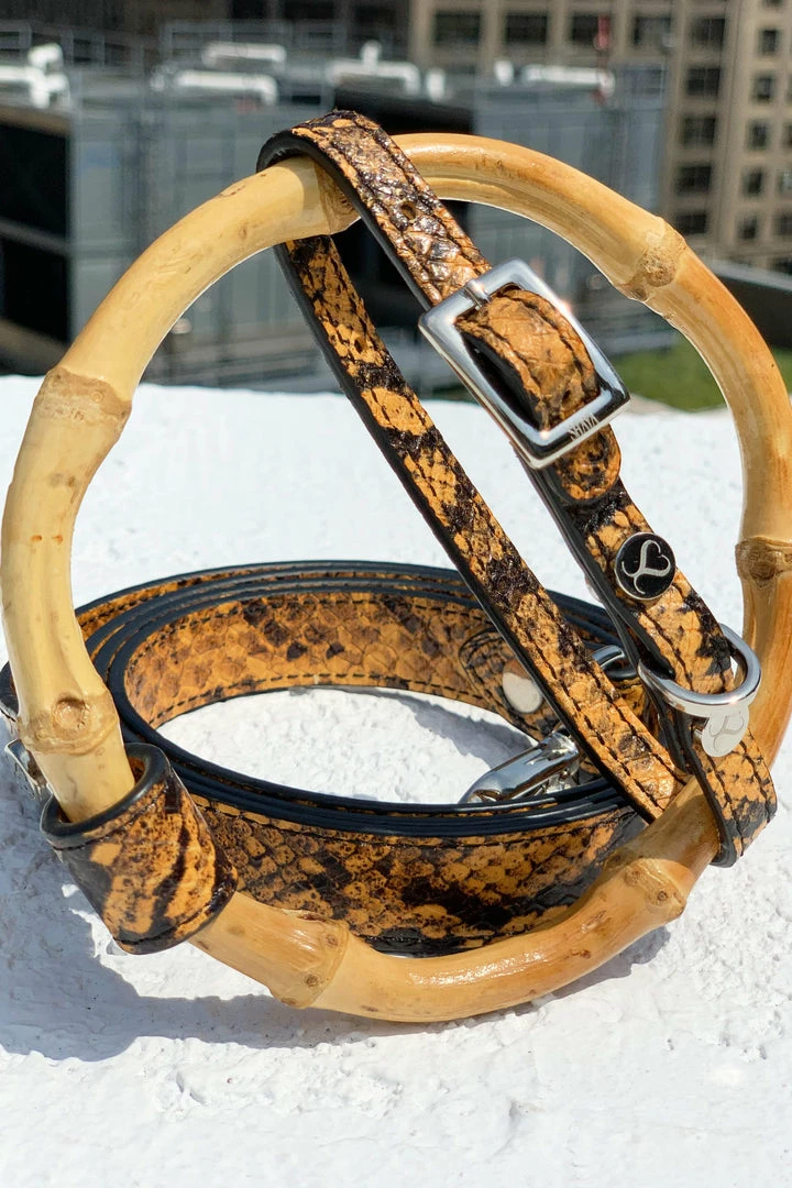 This limited edition Sasha leash is created for the ultimate strut with your pup. Using a special embossing technique that mimics the look and feel of python – without the cruelty or price tag. Made with the Sasha signature bamboo handle that fits perfectly on your wrist and is easy to hold onto. Your walks have never been so fashionable.