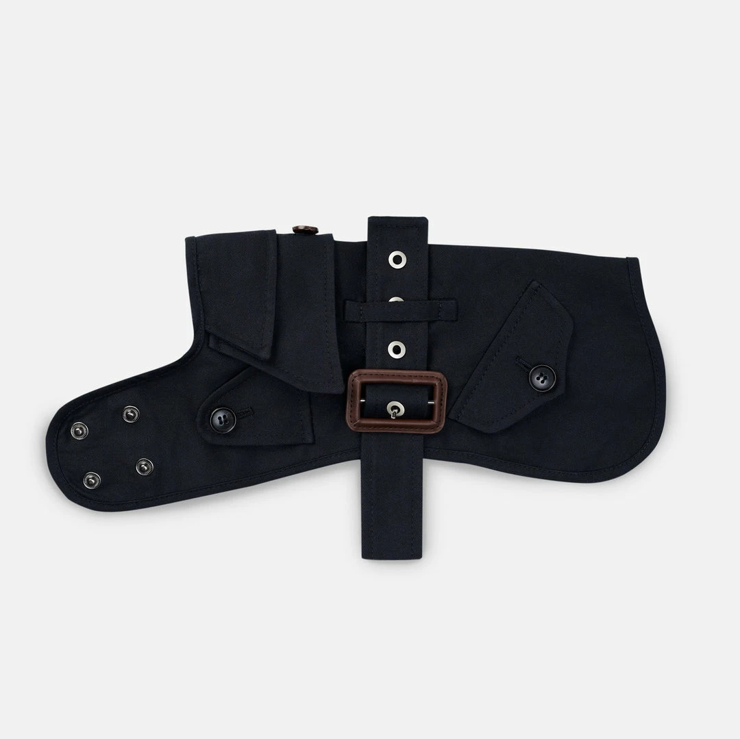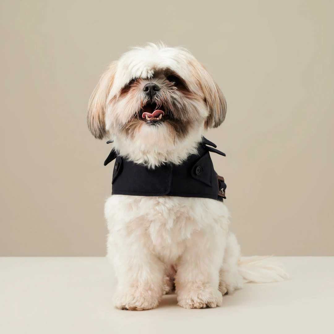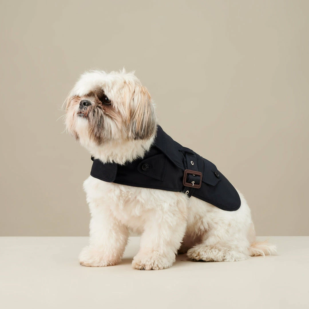 “As a shortΒ haired breed, I sometimes get a little chilly. Keep me cozy and warm in this soft navy trench coat. The easy-to-fasted belt has metal eyelets for durability, real horn buttons, and a leather buckle for a touch of flair.”Β – Nala, Greyhound