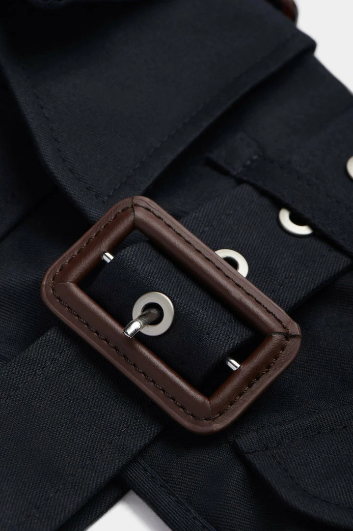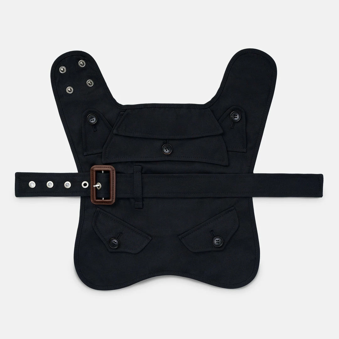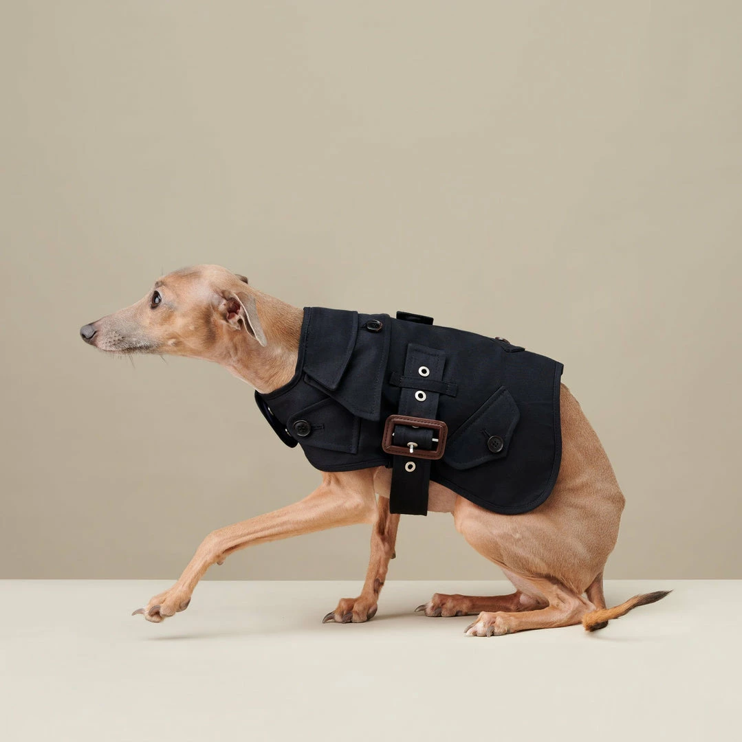 “As a shortΒ haired breed, I sometimes get a little chilly. Keep me cozy and warm in this soft navy trench coat. The easy-to-fasted belt has metal eyelets for durability, real horn buttons, and a leather buckle for a touch of flair.”Β – Nala, Greyhound