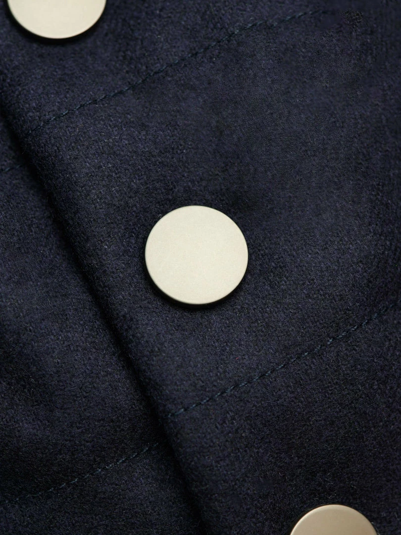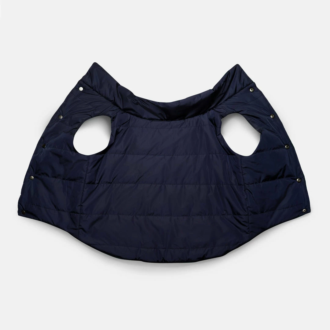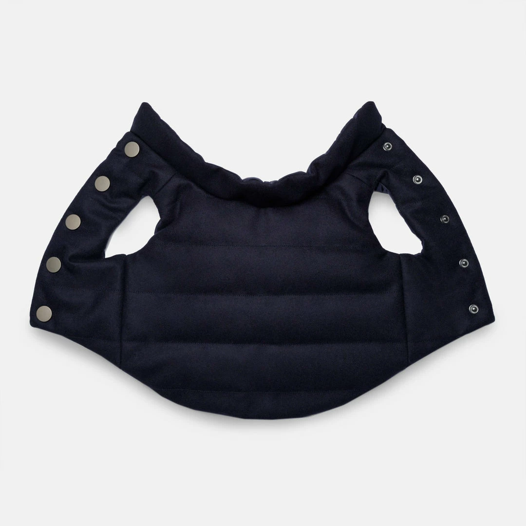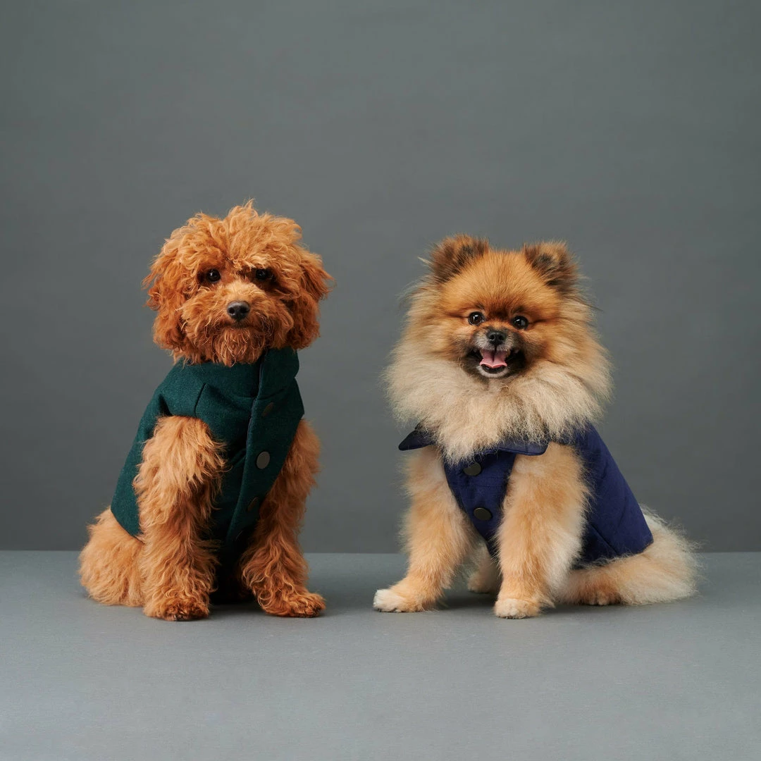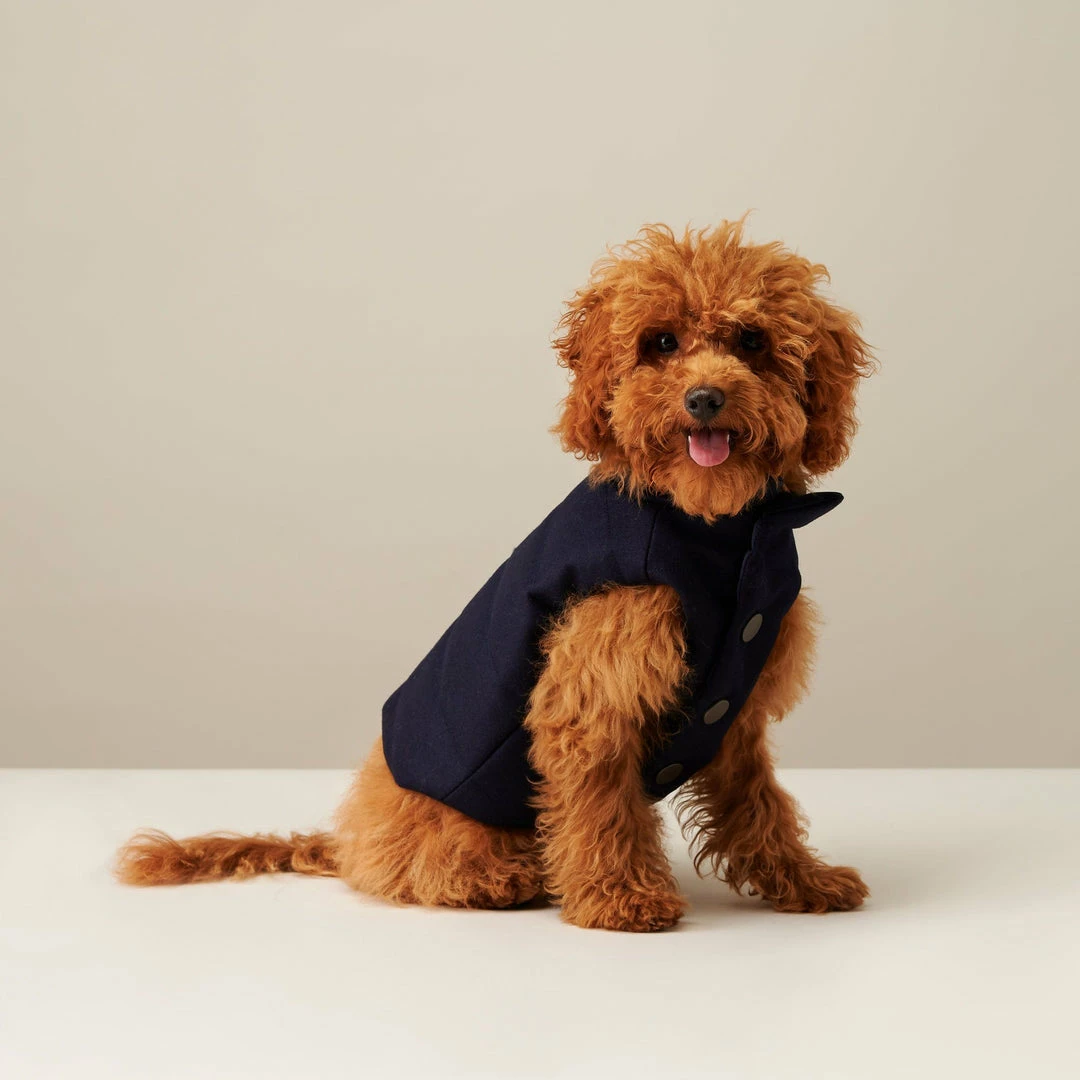 “This reversible navy puffer is always a hit at the park! The brass-plated snap buttons make it a cinch to put on, the waterproof wool blend keeps me dry & cozy, and the faux down filling give me just the right amount of warmth.” – Bernard, Toy Poodle